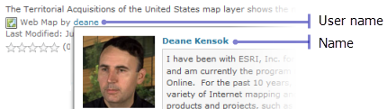 Ihr Name wird oben auf der Profilseite angezeigt, wenn jemand auf Ihren Benutzernamen klickt. Ihr Benutzername wird in den Details Ihrer Gruppen und Inhalte angezeigt. Beispielsweise wird auf der Seite mit den Suchergebnissen möglicherweise eine Auflistung für Webkarte von deane angezeigt, und wenn Sie auf deane klicken, wird ein Profil für Deane Kensok geöffnet.